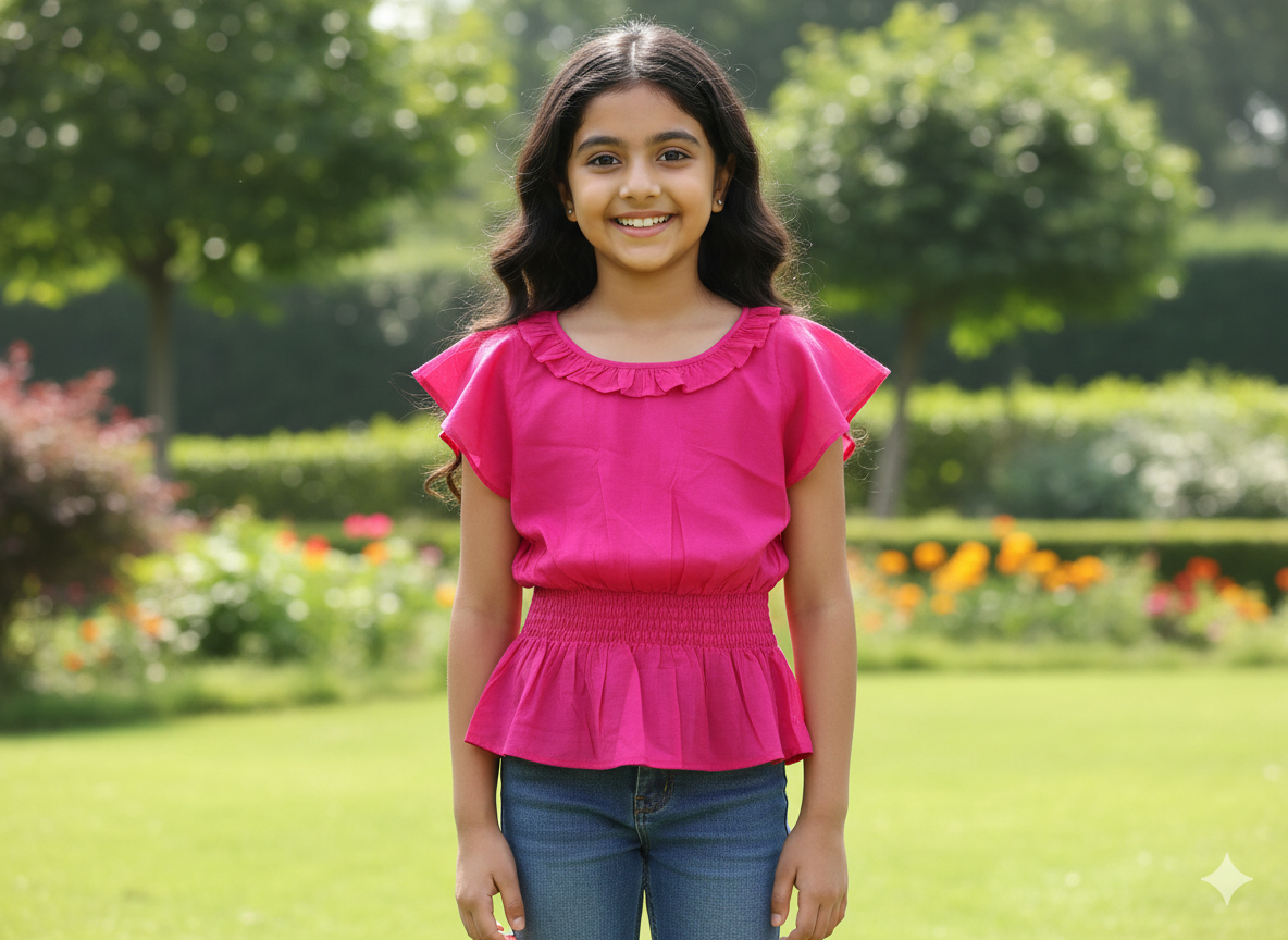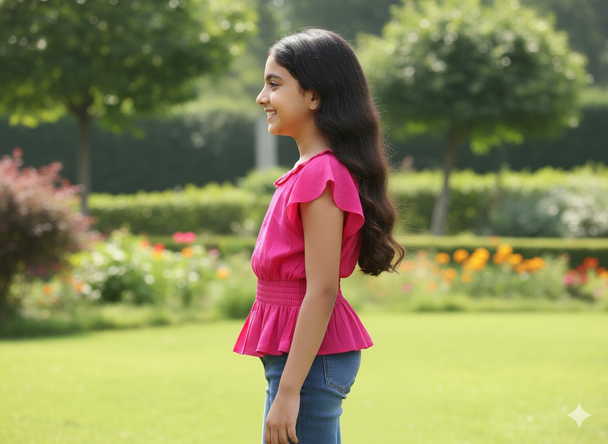 A young girl with long, dark, wavy hair is standing in a lush green park. She is smiling broadly, revealing her teeth. She is wearing a vibrant fuchsia pink top with a ruffled neckline and elasticized waist, paired with blue denim jeans. The background features blurred green trees, bushes, and some colorful flowers, suggesting a bright, outdoor setting. The lighting is natural, highlighting her features and the color of her top.
