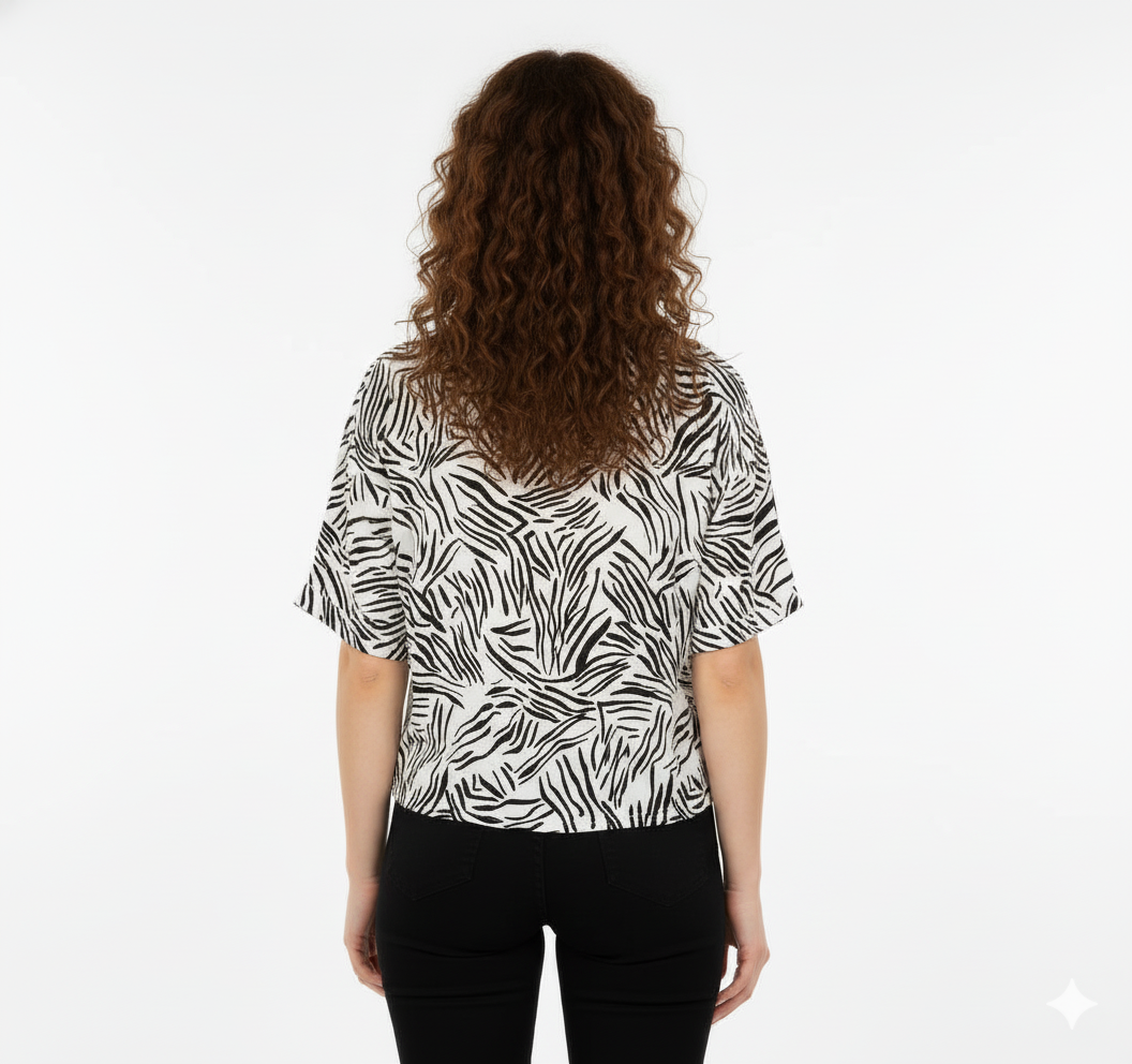 This is a chic, short-sleeved button-down top featuring a bold black-and-white zebra print pattern. It has a relaxed fit with dropped shoulders, giving it a breezy and effortless vibe. The shirt includes a front tie-knot detail at the hem, adding a trendy and flattering touch to the silhouette. Designed with a classic collar and lightweight fabric, it’s perfect for casual outings or smart-casual looks when paired with jeans or trousers.